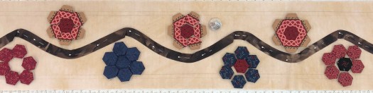 Now on to progress on Mountmellick. I still have a lot of EPP to do to finish the flowers and have now changed the border fabric and vine fabric. I am going to add more of the EPP flowers that are in the Medallion using the same fabric. Then I will add red and blue flowers and no leaves! Here is a picture of the border. There is only one completed flower, the rest are ready to be sewn together. The vine will be about 1/4” wide! I applique one side down and then trim and applique the other side down. No glue, etc!