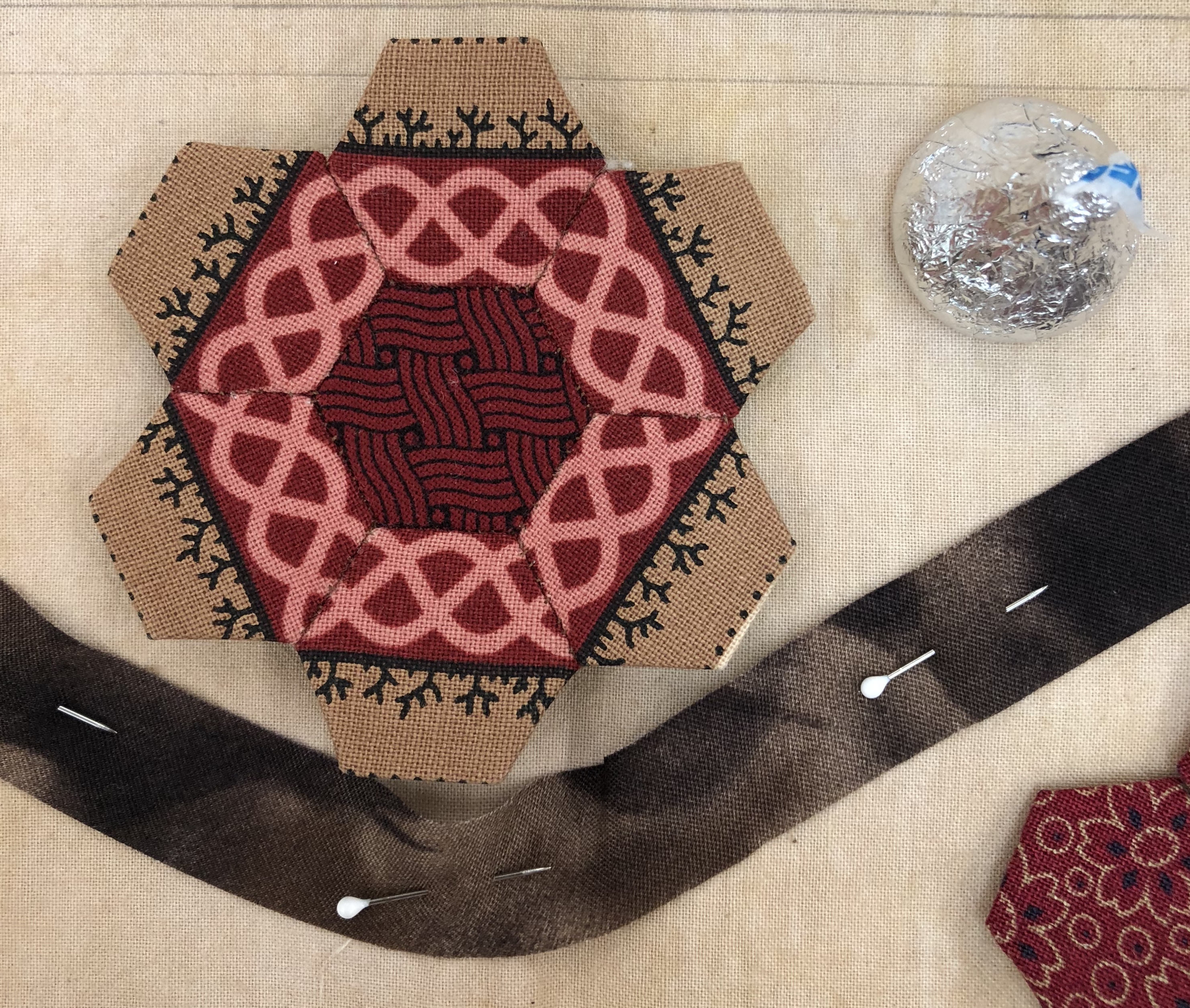 To give you an idea of what I am working with on the size of the hexagon papers, here is a picture of a completed flower next to a Hershey Kiss!