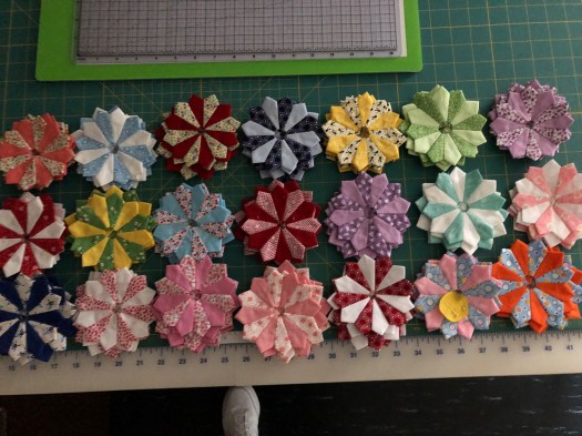 I am working on finishing the larger Dresden Plates (9 inches) that will complete the Dresden Heaven (well…let’s say 1/2 way there)! I have made 105 of the mini Dresden’s and there are 16 larger Dresden’s. I finished 7 today. I decided to do the larger Dresden plates to match dome of the mini-Dresden’s. I am pleased with how this 1930’s fabric quilt will turn out. All the Dresden’s will be appliquéd on background fabrics.