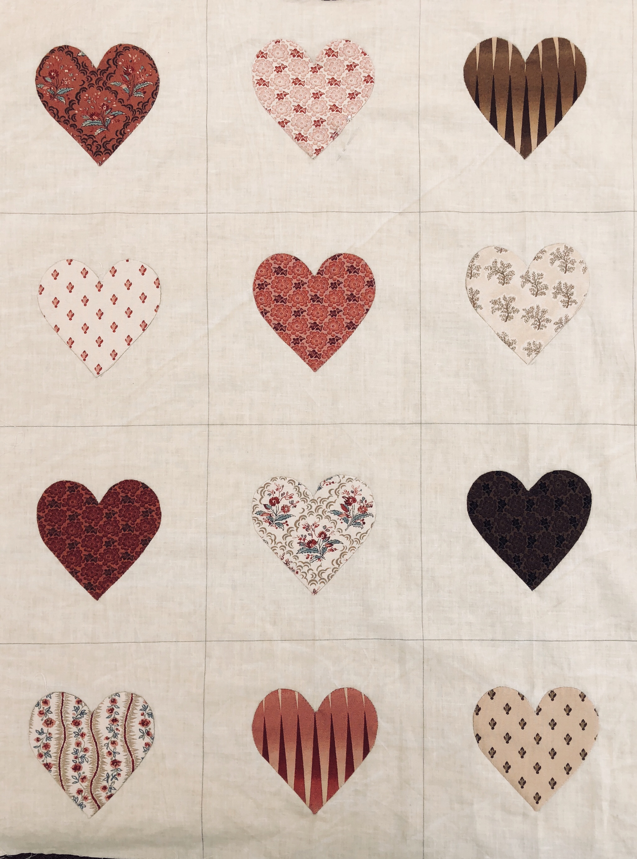 Here are my 12th heart (upper right hand corner) and all 12 that are completed. My hearts are 3 1/2″ and I made a fabric grid of 6″ squares. This makes it much easier to needle turn applique.