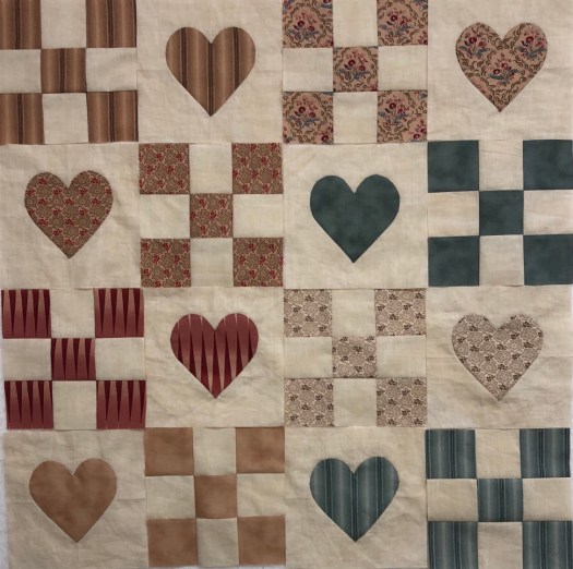 Here is a sample on how I will make the alternating 9 patches. Each heart will have a matching fabric 9 patch. I thnk this will really make my quilt pop! No telling what borders will look like! This is a ‘go as you go along’ quilt!